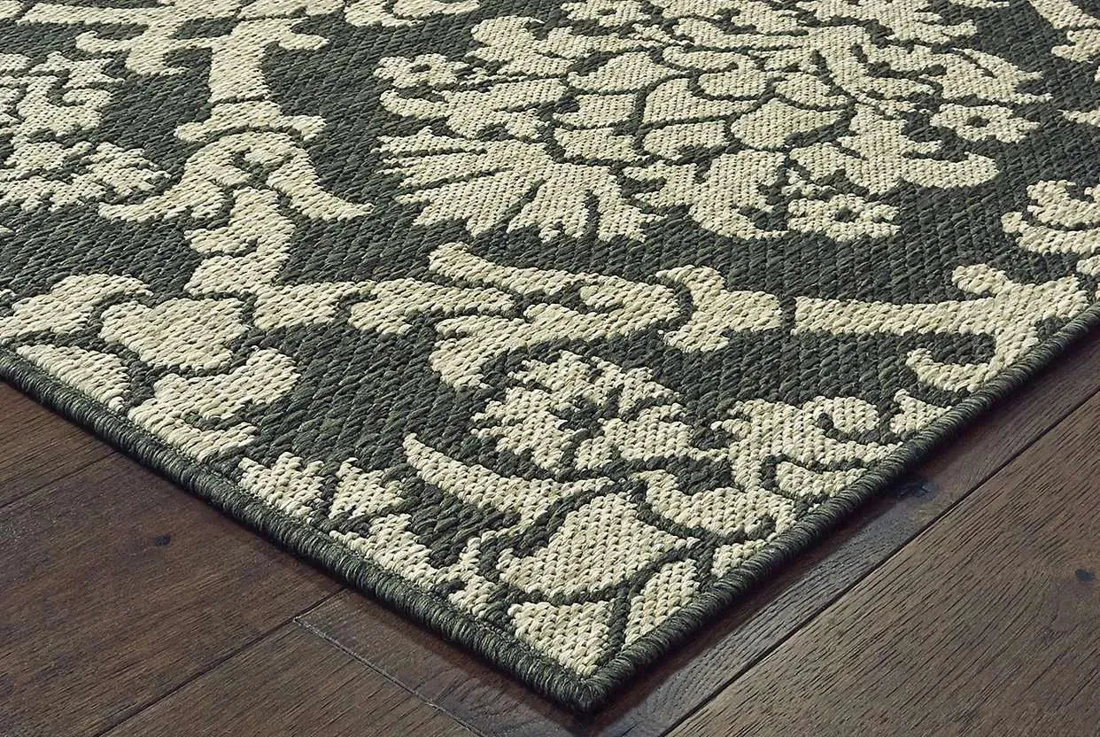 The Latitude collection showcases sophisticated designs ranging from traditional tile and medallion patterns to simple modern borders and geometrics. Multi-colored yarns in neutral grays, accented by tones of deep navy and vibrant persimmon, add texture and a pop of color underfoot. Machine-woven of polypropylene, Latitude is easy to care for and can be used both indoors and out.
