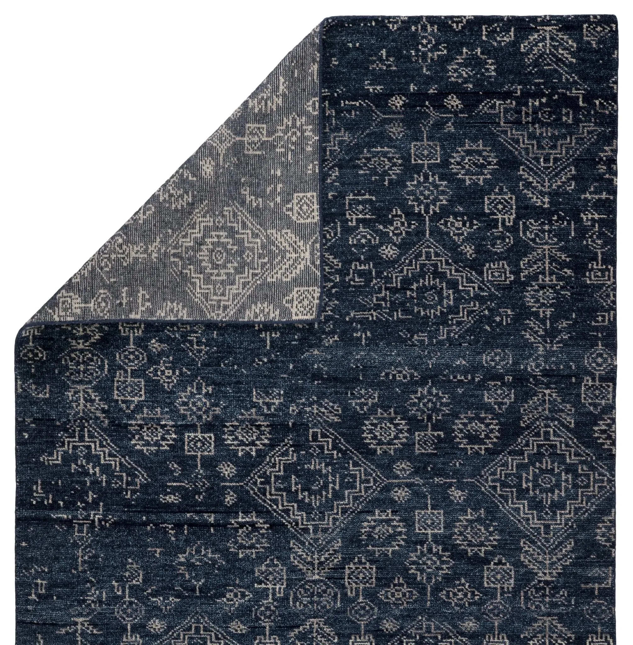 The Liberty collection infuses homes with traditional design and exceptional artisan-made accents. The hand-knotted Azuma rug showcases an all-over tribal motif with broken, distressed details. Deep blue and black tones ground this durable wool rug, while the light gray pattern pops for a transitional look.