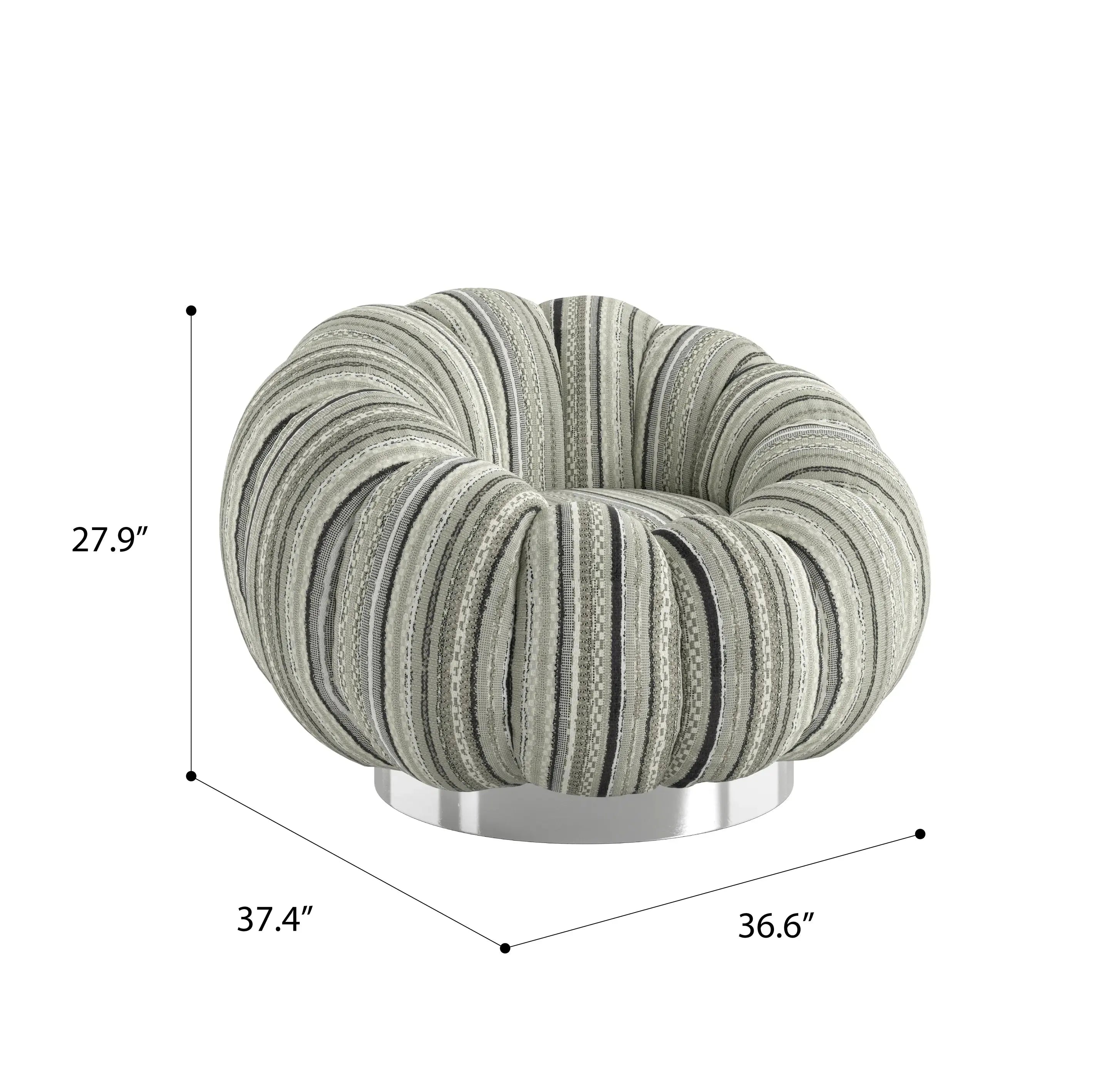 Prepared to envelope you into its soft embrace, the contemporary Lily accent chair will always welcome you with rounded, yet open arms. Its unique pumpkin shape is formed from thick channels of tightly filled cushions wrapped in a monotone striped print fabric from top to bottom that flows around you for complete support. The striking design is finished with a silver metal base that swivels 360 degrees for hours of endless relaxation.