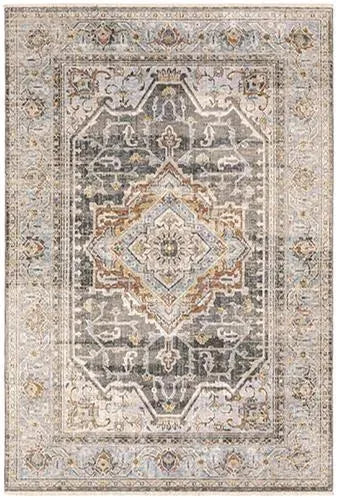 Maharaja is a study in understated elegance. This million point collection is full of sophisticated traditional designs that have been re-imagined into a lovely new color palette. Timeless neutral tones alongside mellow shades of bluestone and muted amber offer subtle treatments for intricately detailed patterns. These beautiful rugs are powerloomed of incredibly soft, space-dyed polyester.