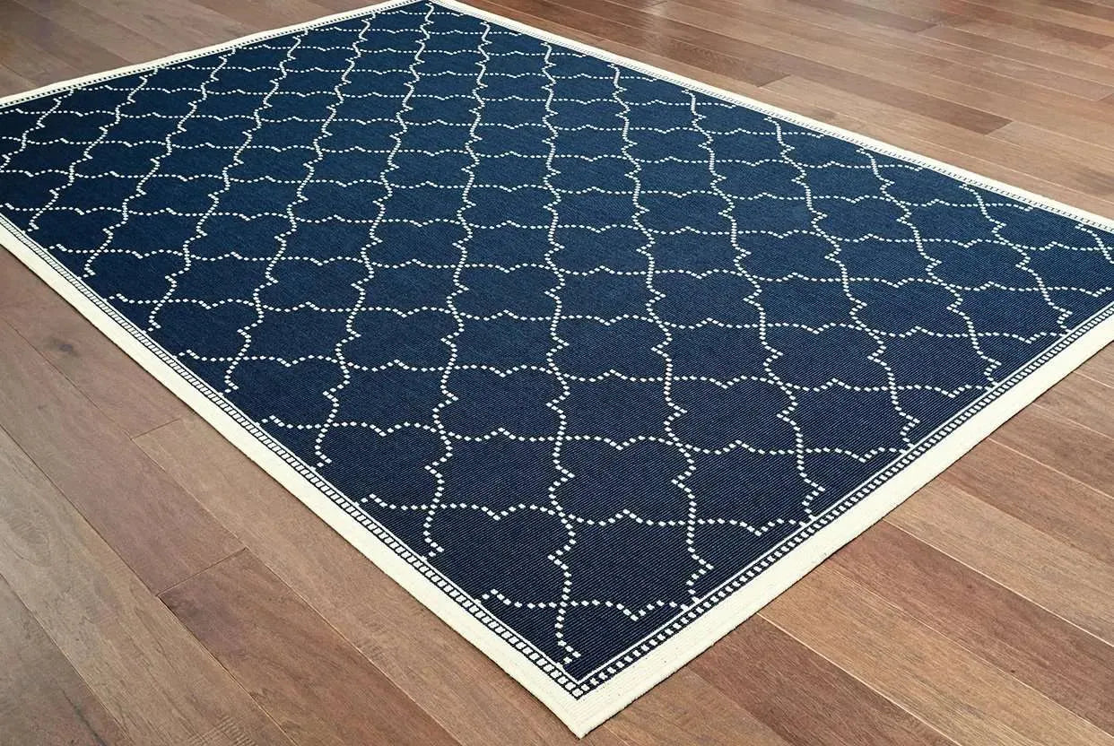 Marina is an elegant new introduction for indoor or outdoor use and features a 100% polypropylene looped yarn made in Egypt. It features a classic neutral palette using high contrast colors like black, ivory, deep navy, sand and cool gray. The collection includes casual but sophisticated patterns like updated geometrics and simplified traditionals that all feel fresh but timeless.