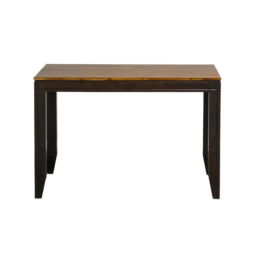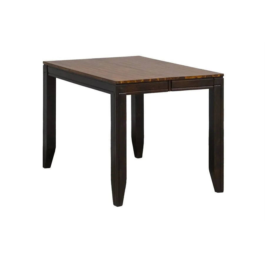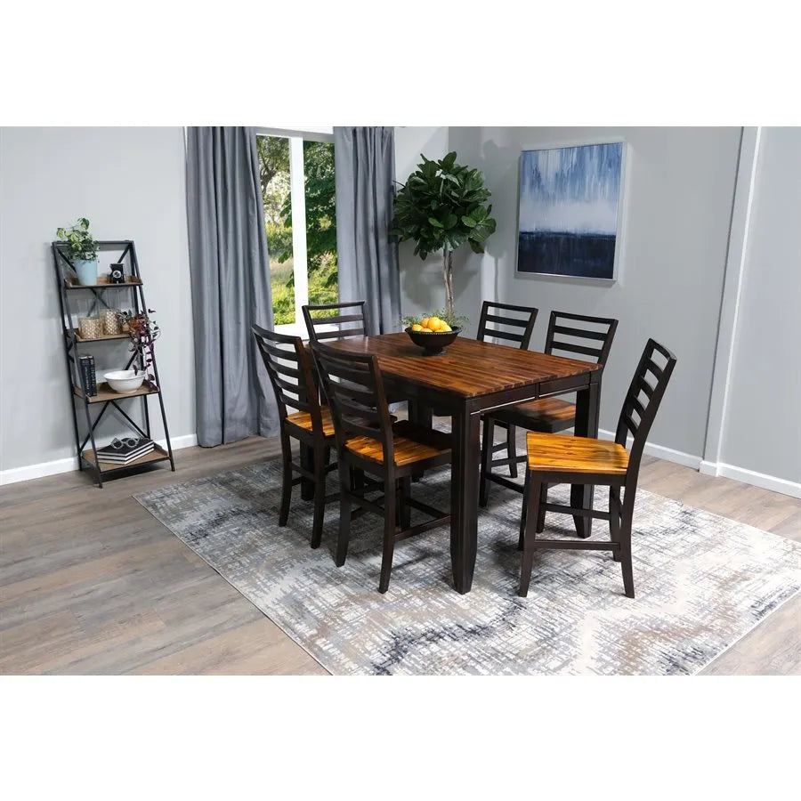 Like the best of outfits, the Melissa collection bridges the space between casual and formal. Inset channels across the apron and down the legs accentuate the tailoring of blocks legs that gracefully taper as they near the floor. With a self-storing butterfly leaf, the gathering height table easily converts from a table for six to a party for eight. Shaped and contoured wood seats invite you to perch atop the ladderback barstool for a quick breakfast or leisurely brunch. Every movement of light across the solid acacia wood construction brings this two-tone finish to life. Caramel colors swirl across the grain on the tabletop and seats, then settles into a deep glow in the dark brown bases. Watch how the colors shift from sunlight to candlelight as Melissa seamlessly transitions with your dining space from day to night.