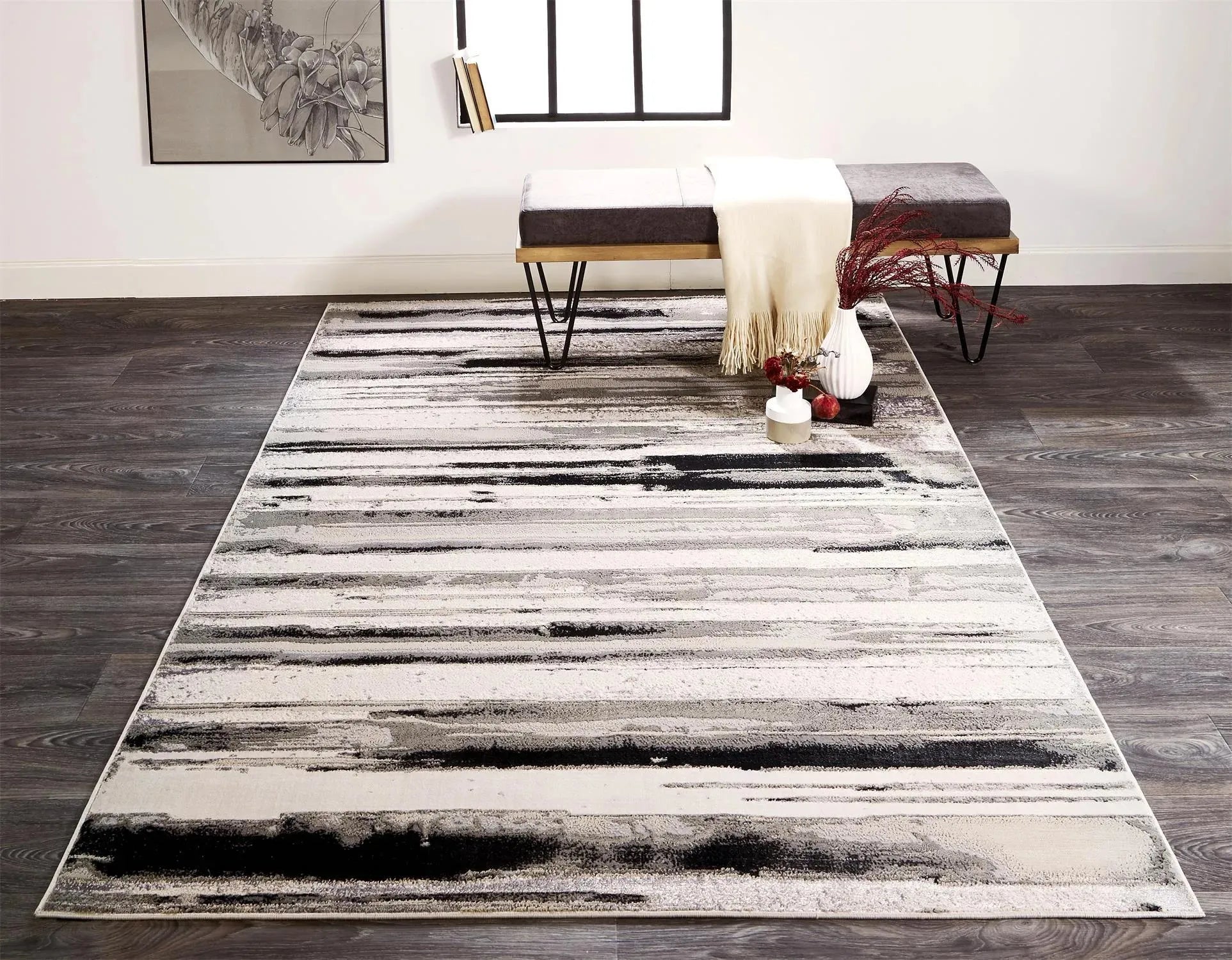The Micah Collection is woven with high-grade shrink polyester fibers adding a subtle depth to the super-soft polypropylene and metallic polyester fibers. The result is stunning shimmering pieces with intricately detailed texture uncommon in power-loomed rugs. With a palette of ecru hues of gray silver and black the designs lend themselves to transitional and contemporary settings alike and are capable of withstanding high traffic areas. On-trend patterns dance across each pile as the light plays off the accents of metallic fibers strategically woven into each design.