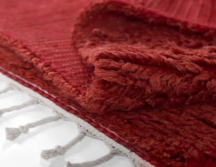 Before the first wash, the back of each rug is mildly burnt with hand-held flame emitting stoves. The rugs are given two rounds of rigorous washing, to provide the softest comfort underfoot. The finishing process includes hand shearing, with a unique and exaggerated one sided tassel fringe. Each tassel is twisted and rolled by hand into bunches with a knot tied at each end, for a unique hand-crafted appeal.