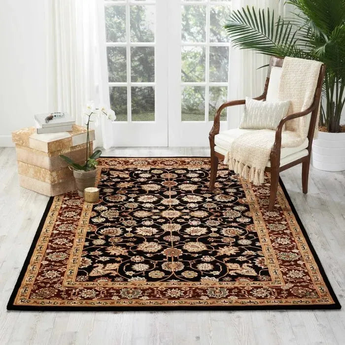 The rug showcases an exceptional Persian floral design with curvaceous leaves, bright blossoms, and other classic botanical motifs, bringing vivid energy to your living space.