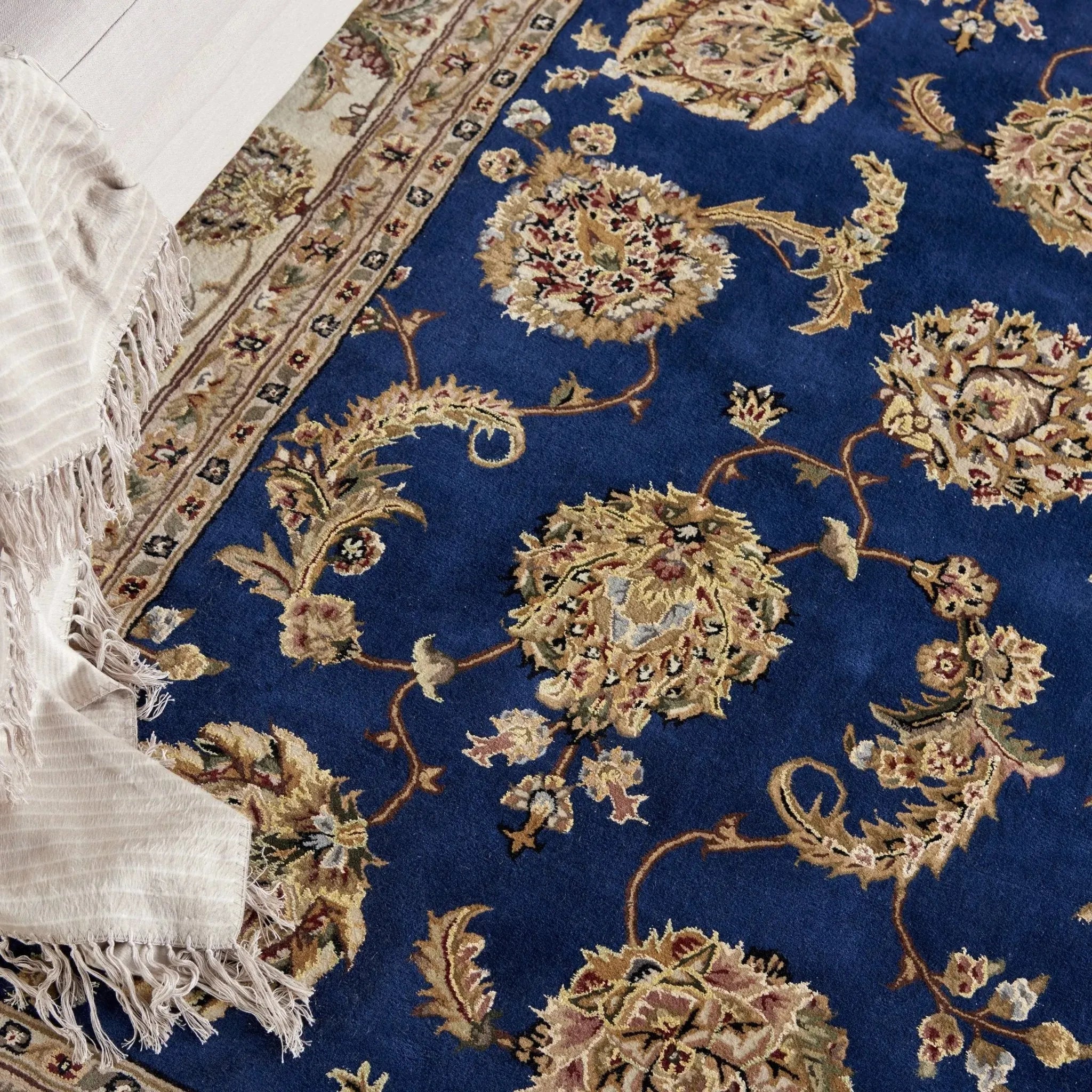 The rug showcases an exceptional Persian floral design with curvaceous leaves, bright blossoms, and other classic botanical motifs, bringing vivid energy to your living space.