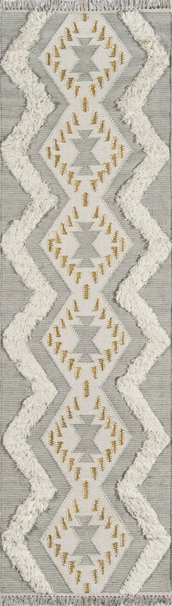 Southwestern-style influences within this handmade area rug collection makes interior floors instantly feel like home. Artful detailing throughout each floorcovering honors the legacy of tribal handicrafts using a distinctive combination of cut and looped wool fibers to define each exotic geometric pattern. Repeating diamond shapes, stripes, triangles and pyramids get a burst of boho chic in shades of pastel pink, sky blue, gray and gold with shaggy accents that emphasize the high-low profile and textural variation underfoot. A signature addition to the Novogratz by Momeni collection, each rug reflects the brandåÕs commitment to creating boutique-worthy home accents with an eclectic attitude thatåÕs accessible for everyday living. This rug is perfect for your living room, dining room, den, bedroom, or any living space