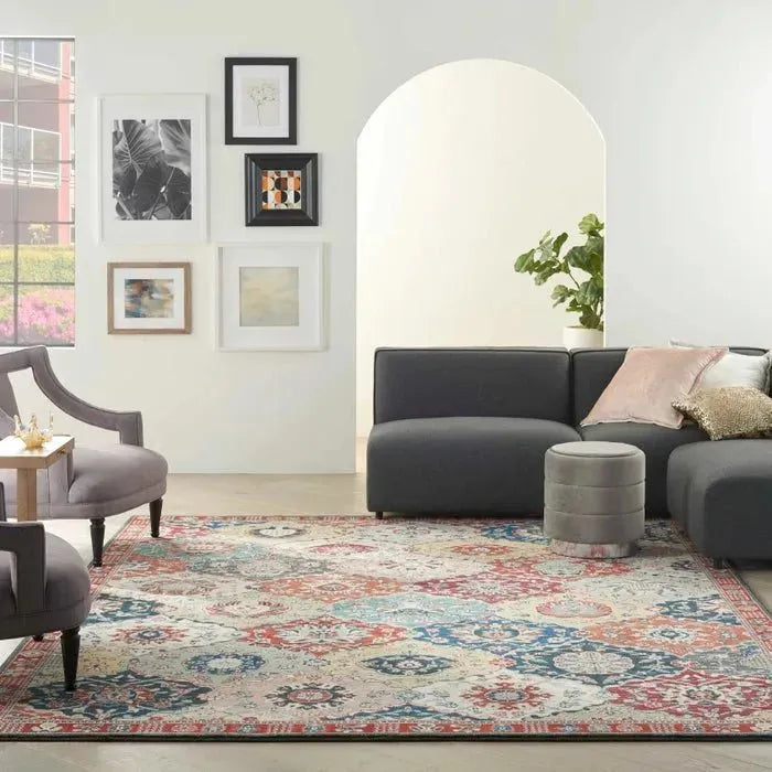 The Parisa PSA06 Denim/Multi Rug comes in various sizes, including 2x10, 5x7, 8x10, 8x11, 9x13, and 12x15 feet, accommodating different room dimensions.