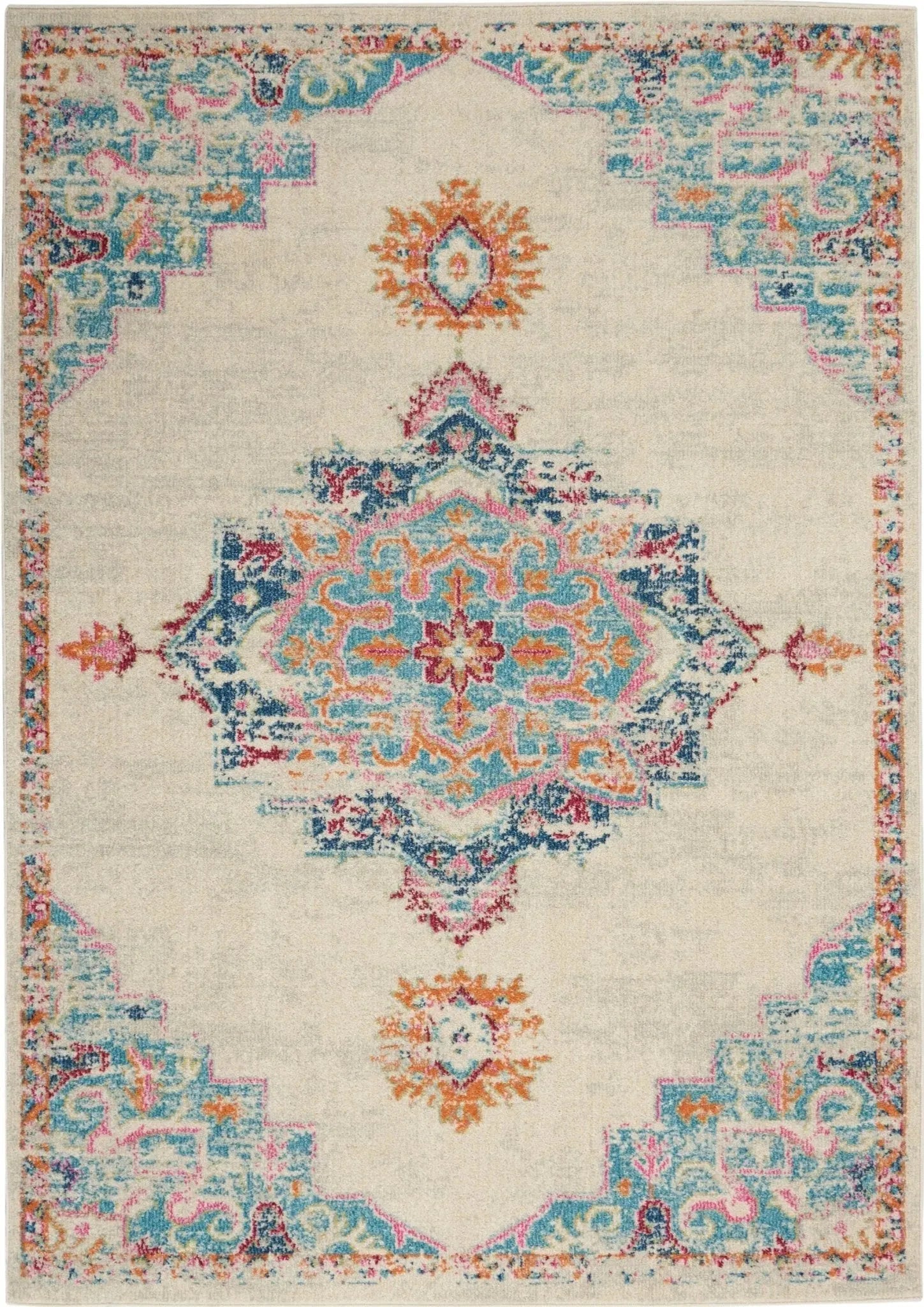 The Parisa PSA06 Denim/Multi Rug comes in various sizes, including 2x10, 5x7, 8x10, 8x11, 9x13, and 12x15 feet, accommodating different room dimensions.