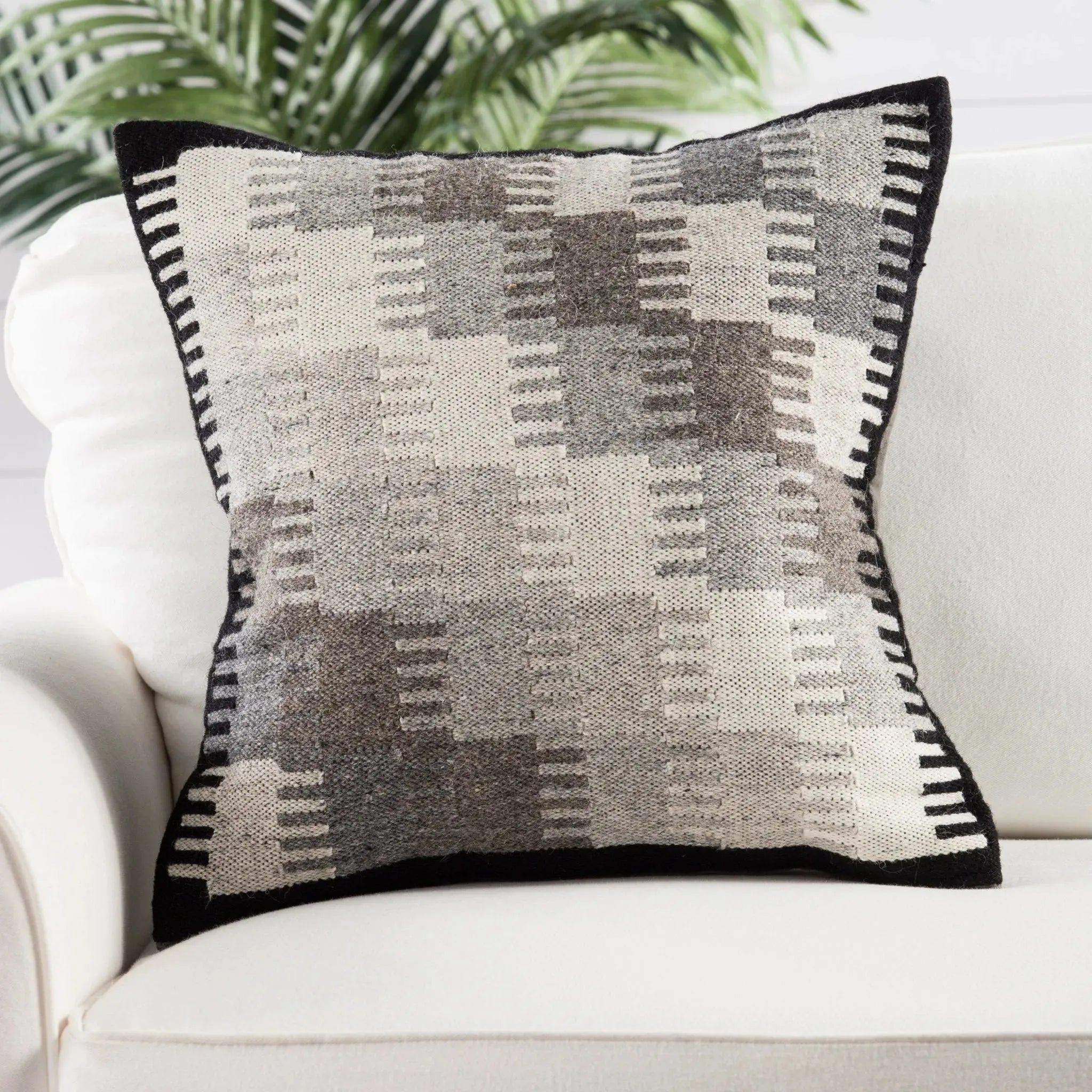 This Scandinavian-style pillow offers rustic vibes and global charm to transitional spaces. Earthy neutrals of gray and taupe meld with cool white and contrasting black to create an angular puzzle-like pattern on this texturally alluring wool and cotton cushion.