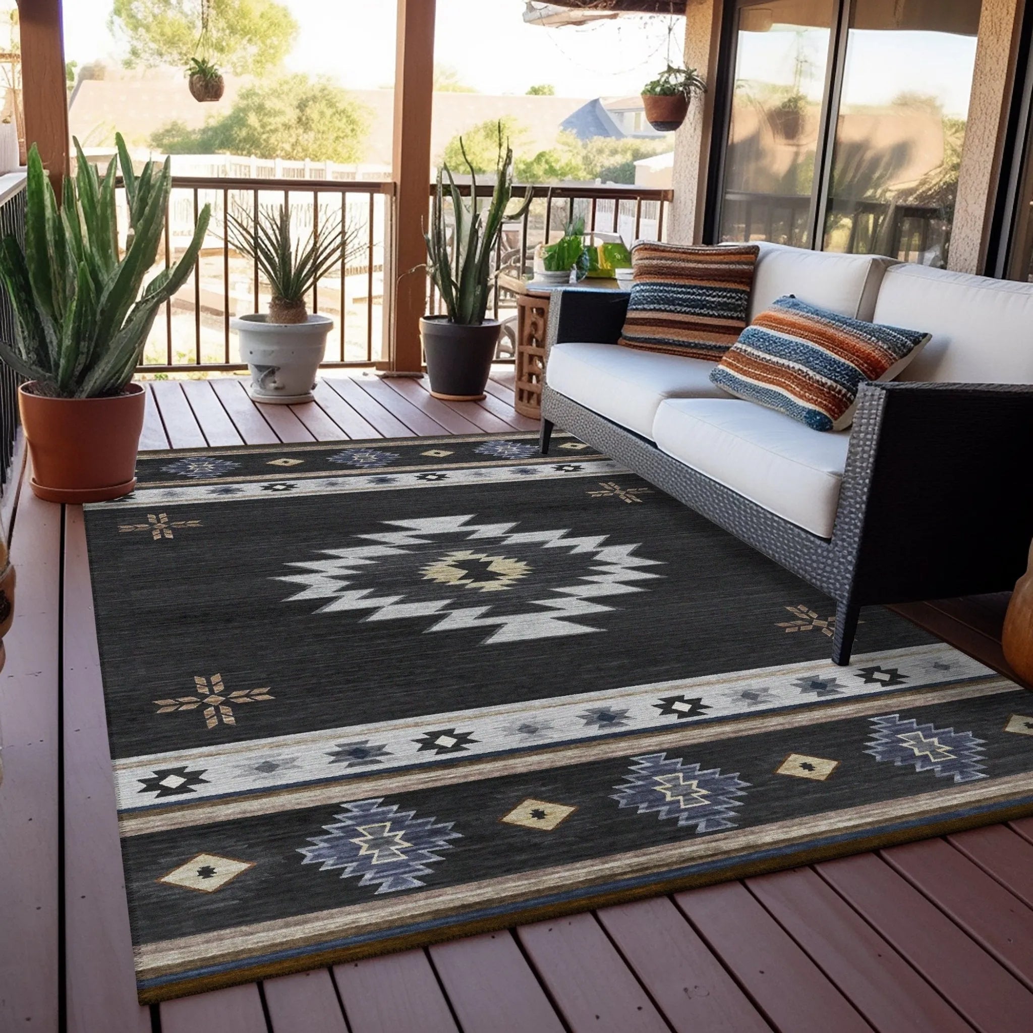 Phoenix collection has great casual southwestern lodge feel. Featuring an ultra-soft and ultra thin pile, each rug is made with 100% polyester pile complete with a non-skid backing. Crafted in the USA using Foreign & Domestic materials and US labor. They are UV Stabilized for indoor and cover outdoor spaces.