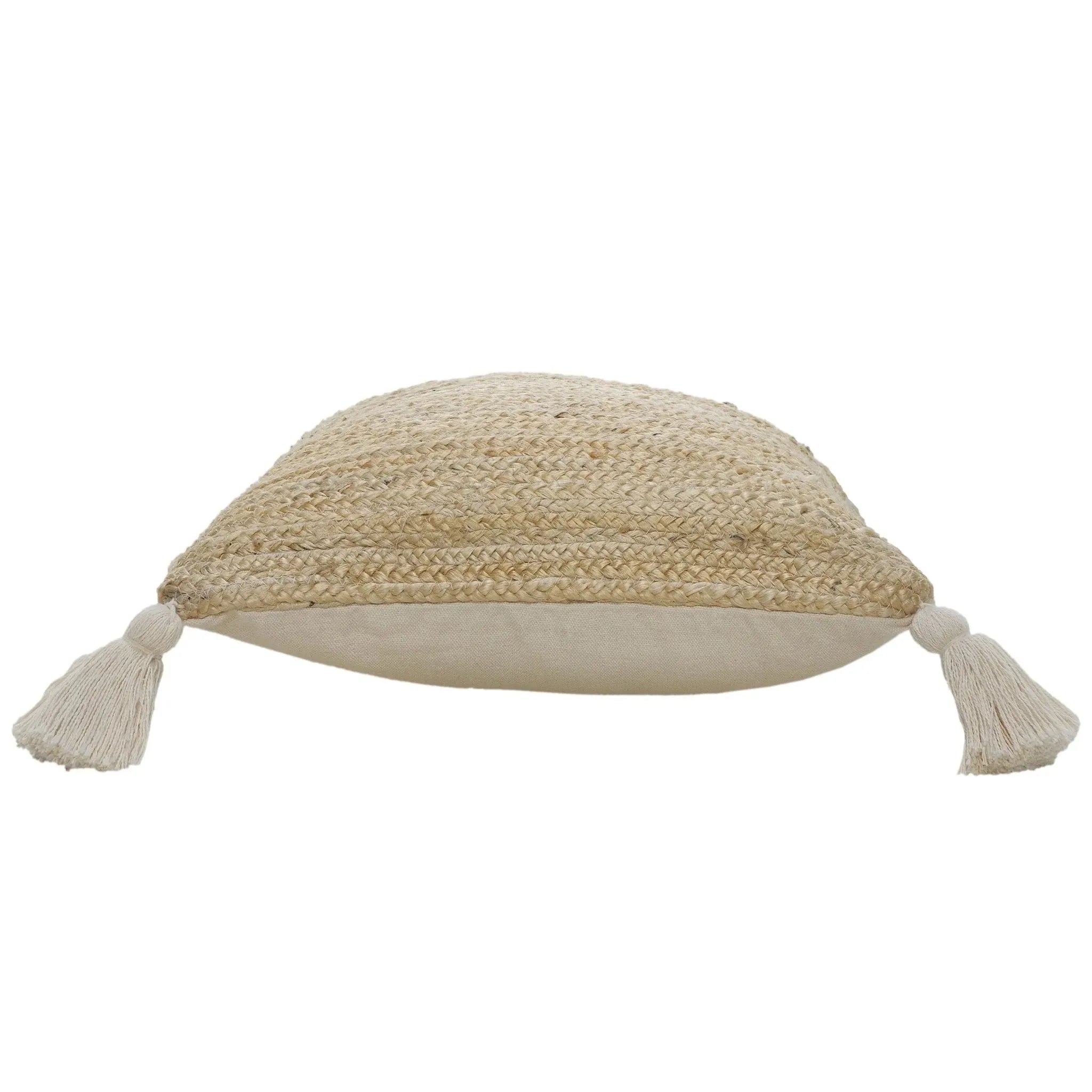 Designed to thrill, our pillow collection will add intricate mastery and eye pleasing designs to any room. This addition dwells perfectly on a comfy couch, bed, or bench. This pillow is a wonderful accent for the trendy home looking to add an eye-catching piece to their collection. This piece features a solid front of natural jute with texted tassels on the corners. Handcrafted with the customer in mind, there is no compromise of comfort and style with the pillow line we create.