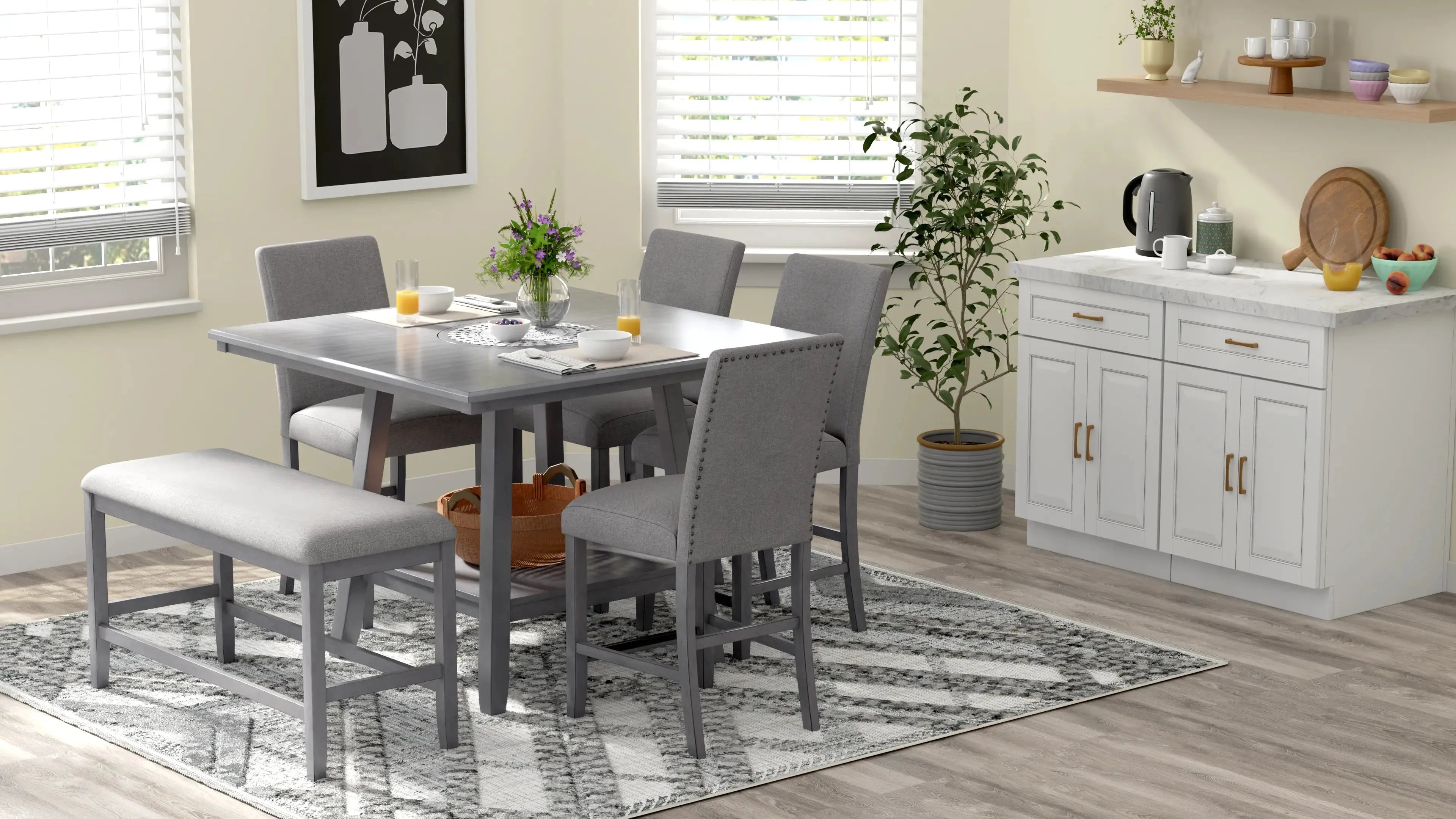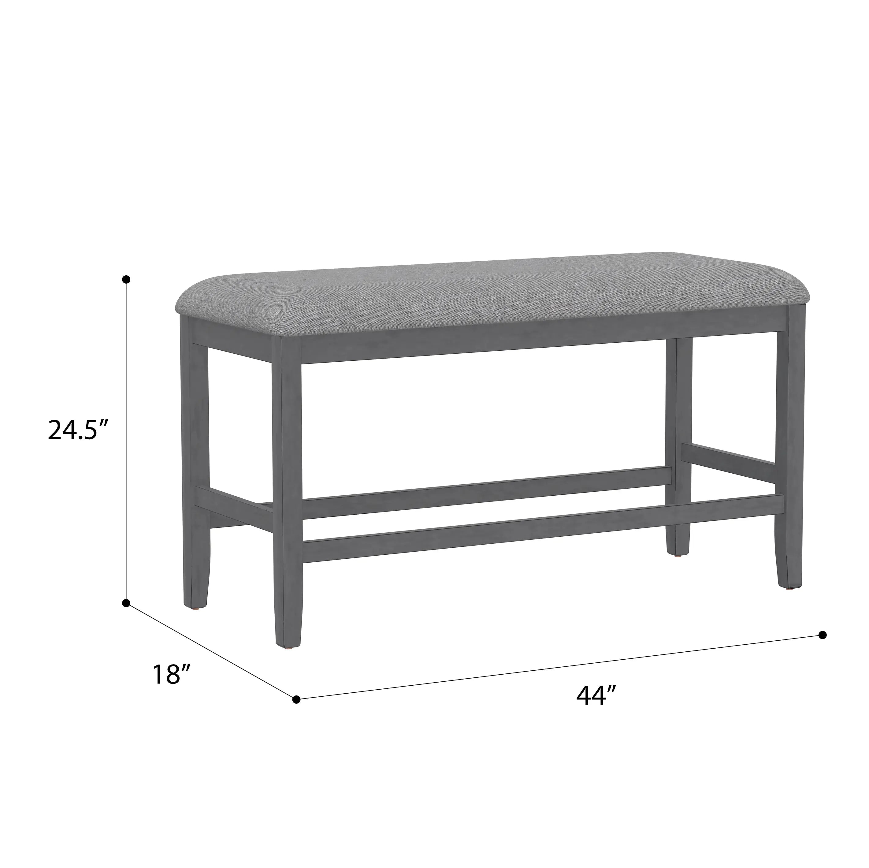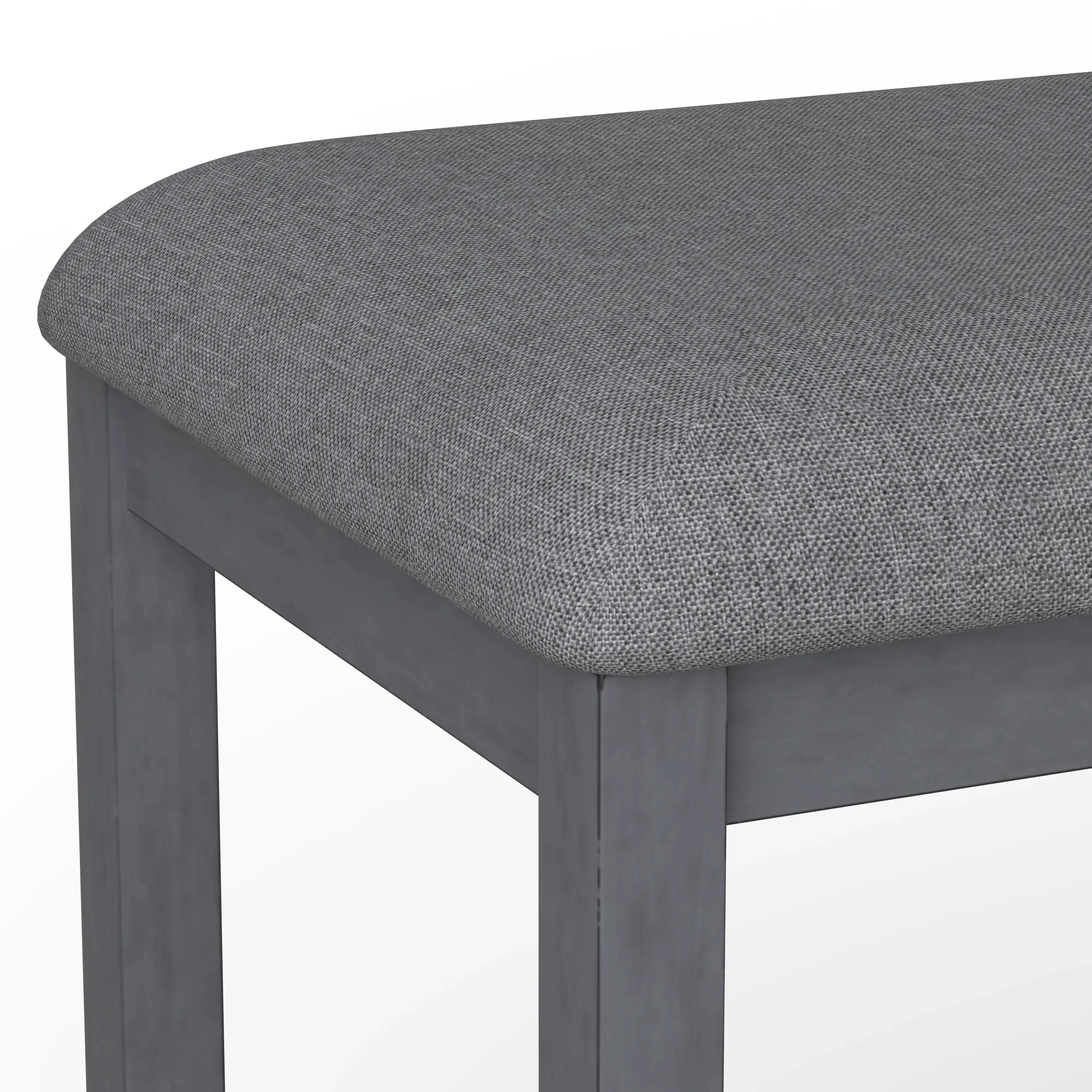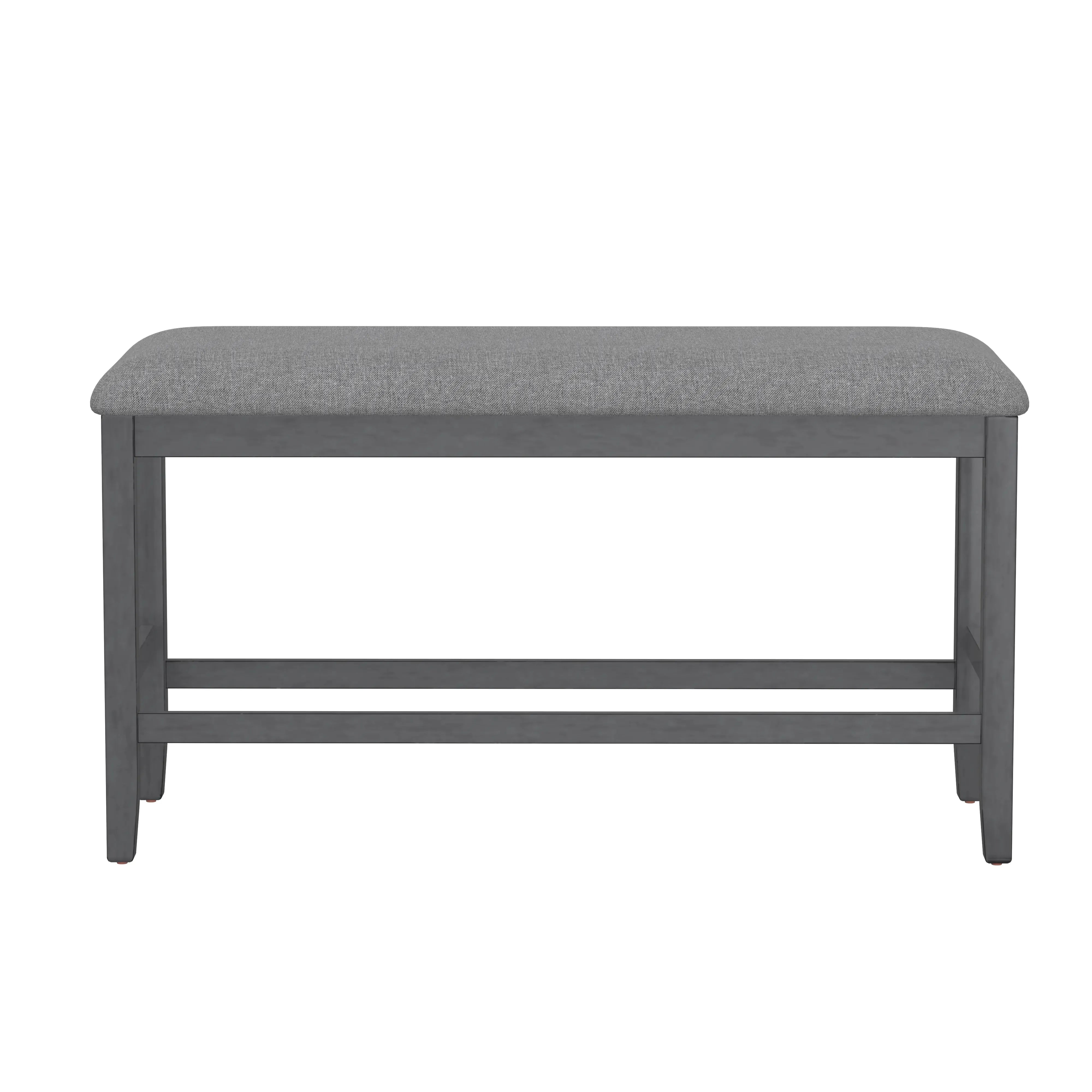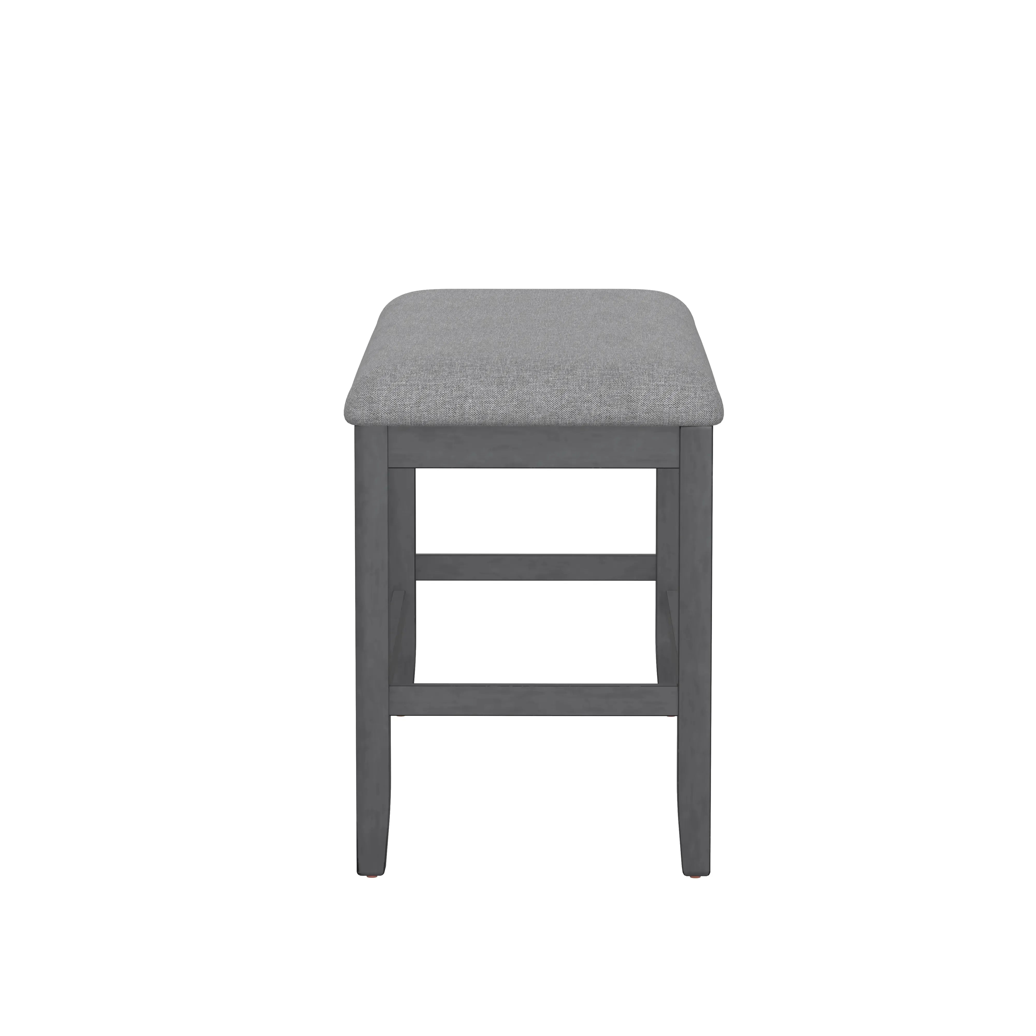 The transitional Seneca collection hosts a unique blend of features and seating options. A delightful medium gray finish on walnut veneers forms a quarter-turned pattern on the tabletop, culminating in the built-in 18” lazy Susan. The tapered frame spreads out to encompass a lower shelf for extra storage. Seating with light gray upholstery and gently curved backs decorated with nailhead trim, you can stay more traditional with just stools or more casual by mixing in a bench or two. A special corner bench converts the look into a banquette perfect for nestling in corners. Accentuate your personal style and give the Seneca a whirl.