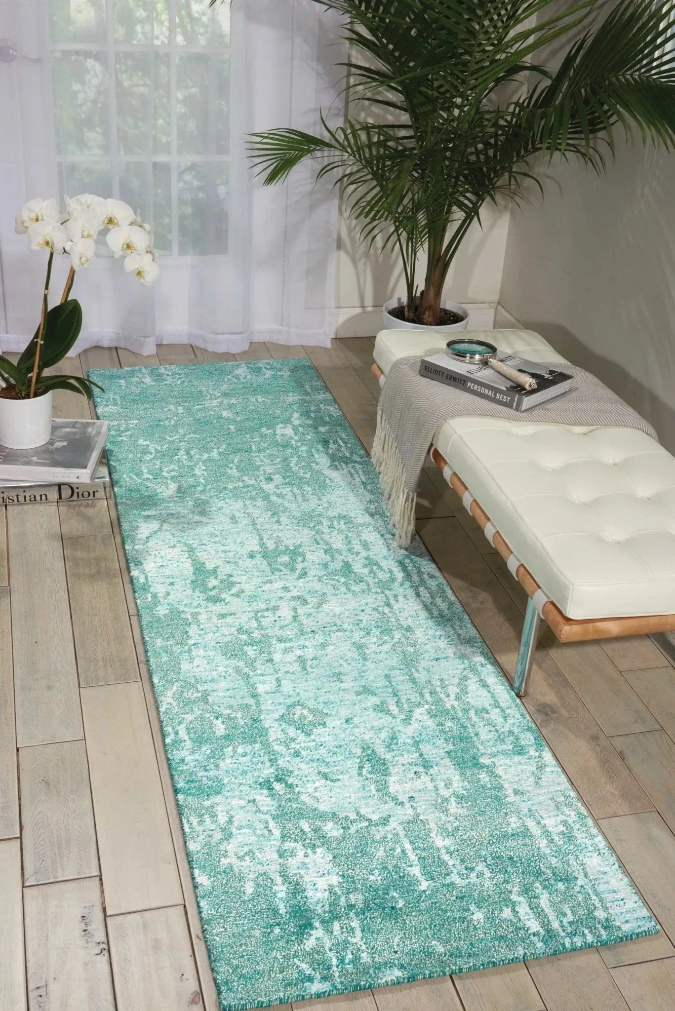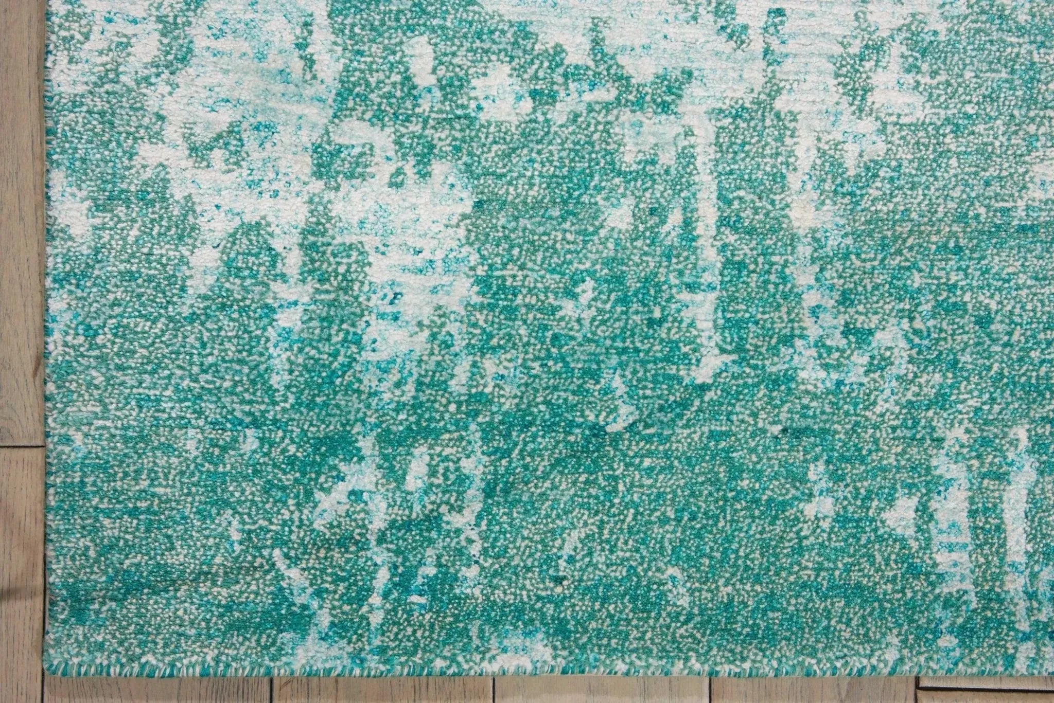Redefine opulence with this luxurious collection of stunningly elegant rugs. Hand woven from premium wool and silk-like bamboo fibers, each velvety soft rug possesses a subtle yet luminous sheen. Designs feature contemporary and transitional motifs with tasteful colors and tone-on-tone contrasts. Featuring contrasting serene shades of tranquil turquoise, a subtle abstract design and splendid shimmering highlights thanks to sensuous silk-like fibers, this mesmerizing hand-woven rug is positively magnetic in its tone, texture and dimension.
