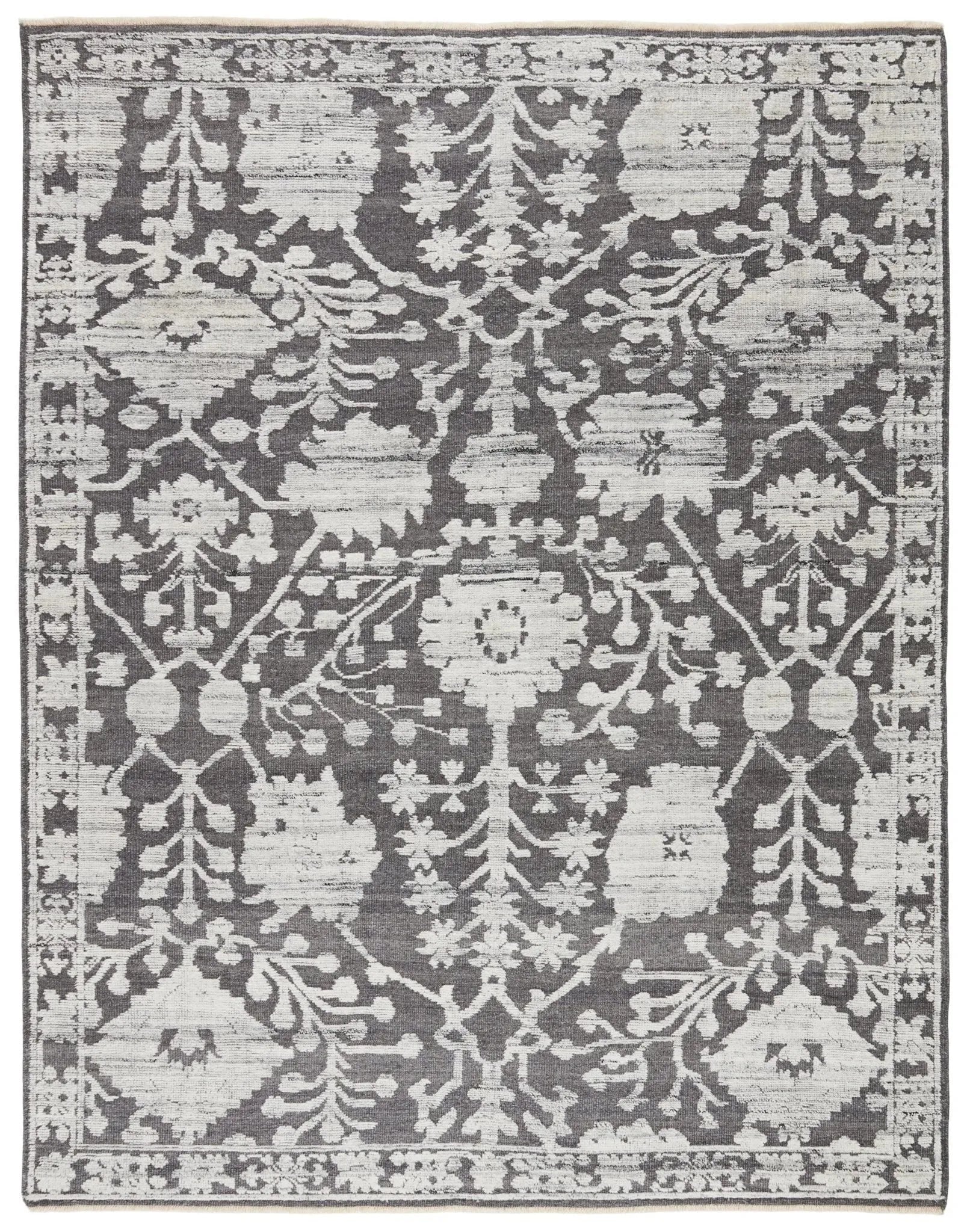 The richly textured and elegantly designed Sonnette collection combines an inviting, soft hand and eye-catching transitional style. The Riona rug boasts a high-contrast gray and silver palette that creates beautiful dimension among the florette medallion design. This hand-knotted wool rug features fringe trimmed details for a touch of global charm.