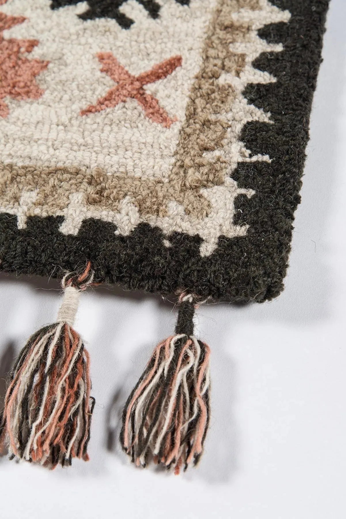 Southwestern motifs get a modern edge in the graphic design elements of this decorative area rug. Available in a stunning array of tribal patterns, each floorcovering features a geometric repeat inspired by iconic tribal prints. Diamonds, crosses, medallions and stars form repeating stripes and intricate linework while tassels at the top and bottom of the rug accentuate the exotic vibe of the with a fun, fringed border. Exceptional in style and composition, each rug is hand hooked from natural wool threads. This rug is perfect for your living room, dining room, den, bedroom, or any living space