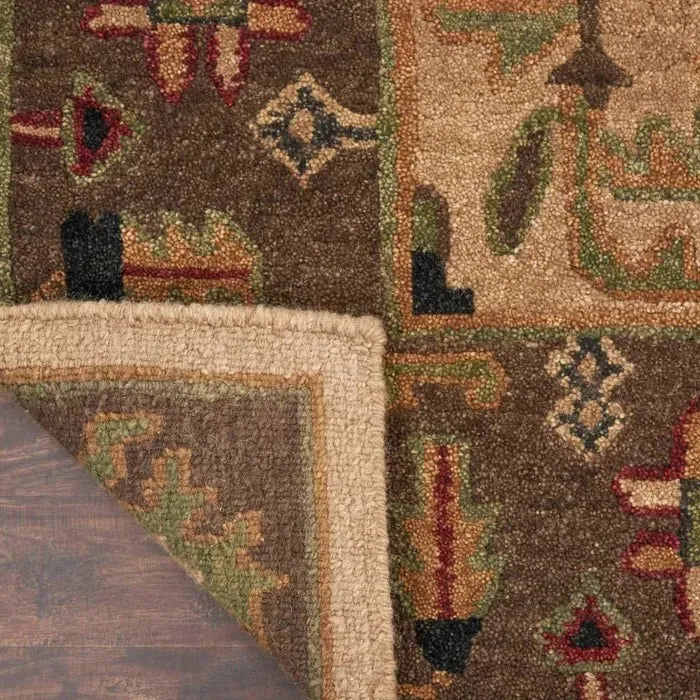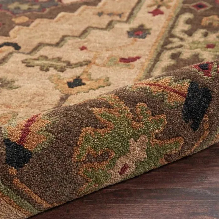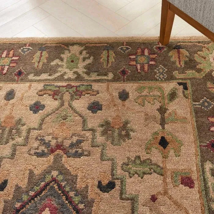 Nourison's Tahoe collection features distinctive, geometric tribal designs in a range of alluring earth tones. Hand-knotted in India of 100% hand-spun and enhanced with a special wash to create a beautiful, subtle patina that will warm up any space. Custom sizes available. This rug is perfect for your living room, dining room, den, bedroom, or any living space.