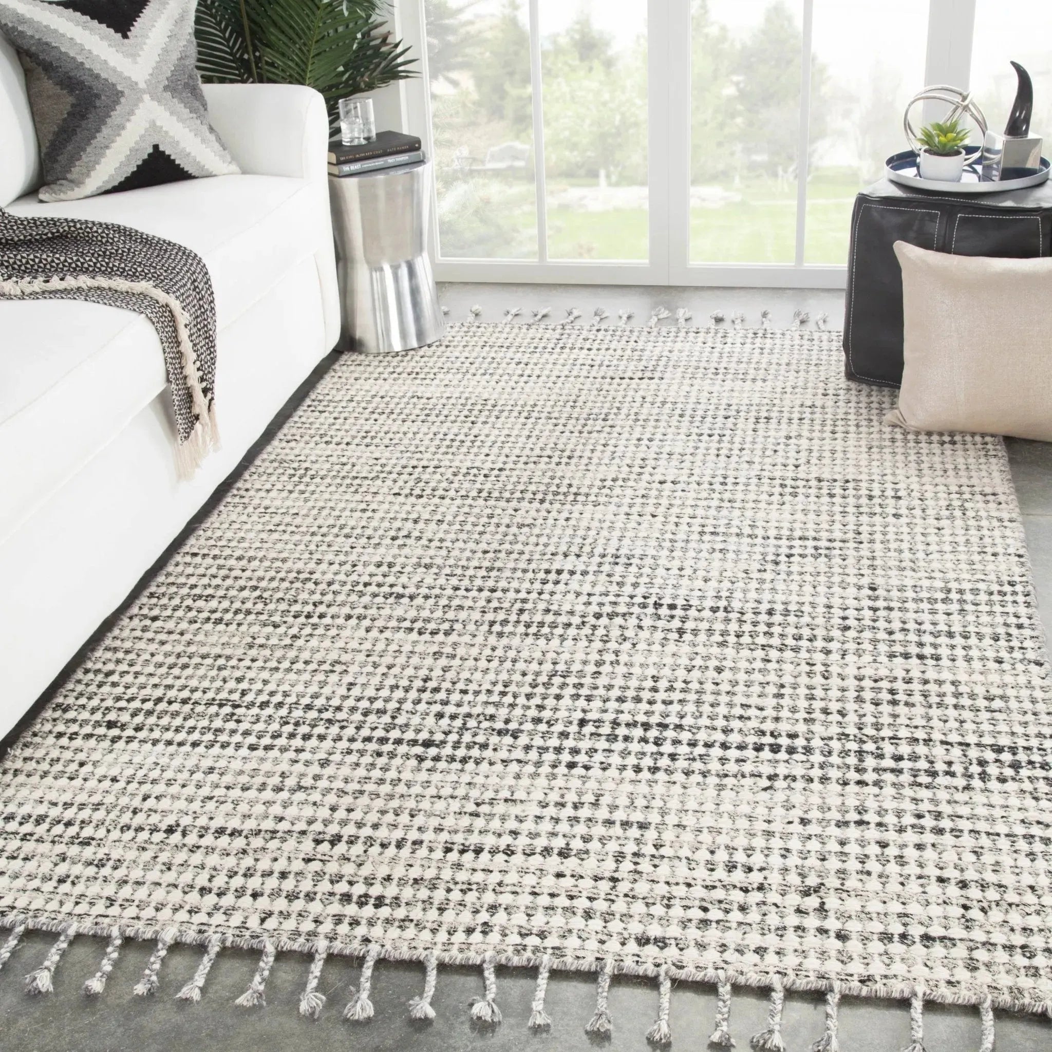 An eco-friendly flatweave made of fine quality wool and recycled sari silk, the Tamil Perkins rug brings one-of-a-kind charm to transitional style spaces. The deep black and ivory color palette creates stylish contrast on the intricate repeating pattern, keenly accented by braided fringe for a worldly bohemian touch.