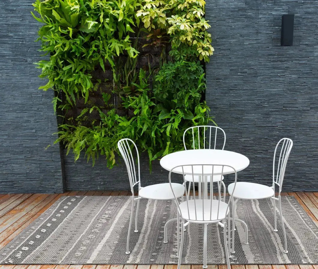 Machine Woven of UV Treated Polyester with No Backing perfect for indoor/outdoor use. Made in Turkey. Vacuum on floor setting only. Spot clean stains with mild soap and water.