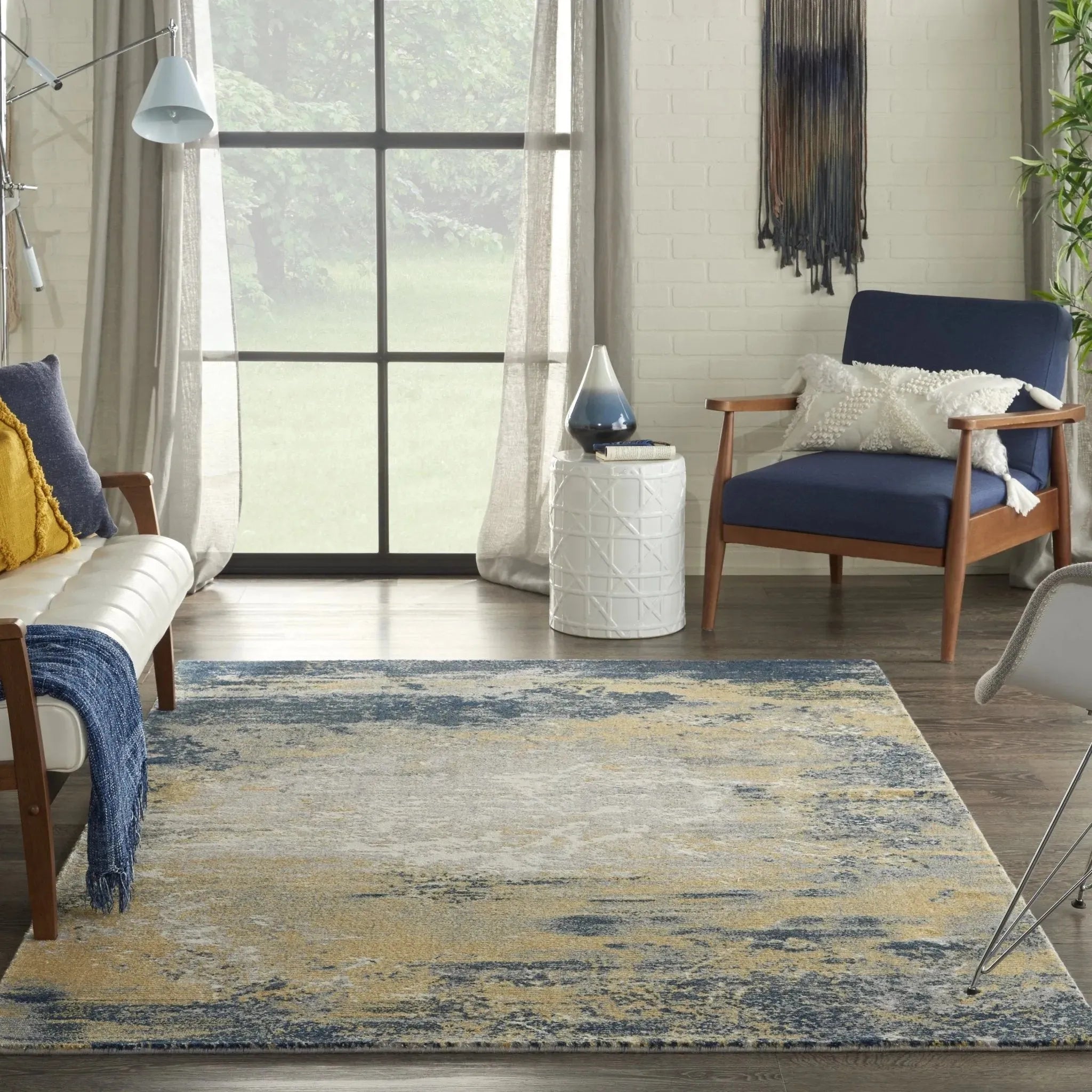 The Parisa PSA06 Denim/Multi Rug comes in various sizes, including 2x10, 5x7, 8x10, 8x11, 9x13, and 12x15 feet, accommodating different room dimensions.