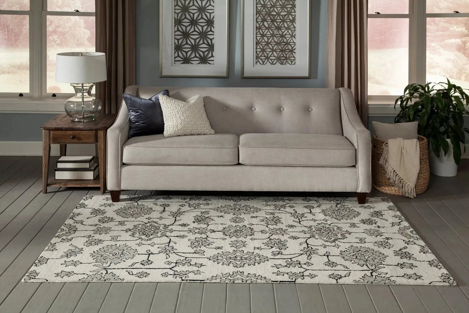 Vintage-style lace detailing in delicately faded neutrals lends this traditional area rug the aura of a European retreat. Ornamental medallions and floral-and-vine motifs provide the perfect focal point for every floor space, with a demure dove grey, sky blue and beige color palette that exudes subtle charm. Hand tufted from a dynamic blend of wool and viscose fibers, each area rug combines classical design with enduring durability that will adorn your floor. This rug is perfect for your living room, dining room, den, bedroom, or any living space