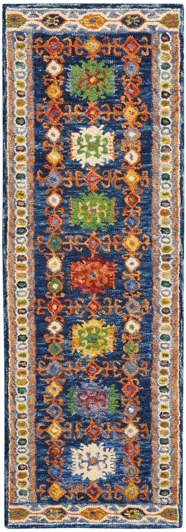 The Parisa PSA06 Denim/Multi Rug comes in various sizes, including 2x10, 5x7, 8x10, 8x11, 9x13, and 12x15 feet, accommodating different room dimensions.