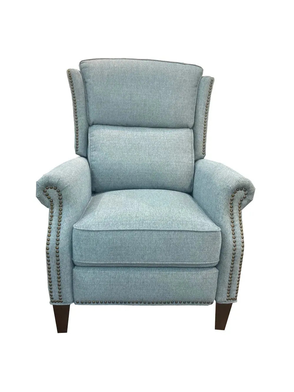 Relax in luxurious comfort with this recliner. It features nail head trim accenting the modified wings, the roll arm fronts, and the bottom edge of the sides and footrest. One touch of a button will recline this chair fully for hours of lounging in your living room, den or family room.