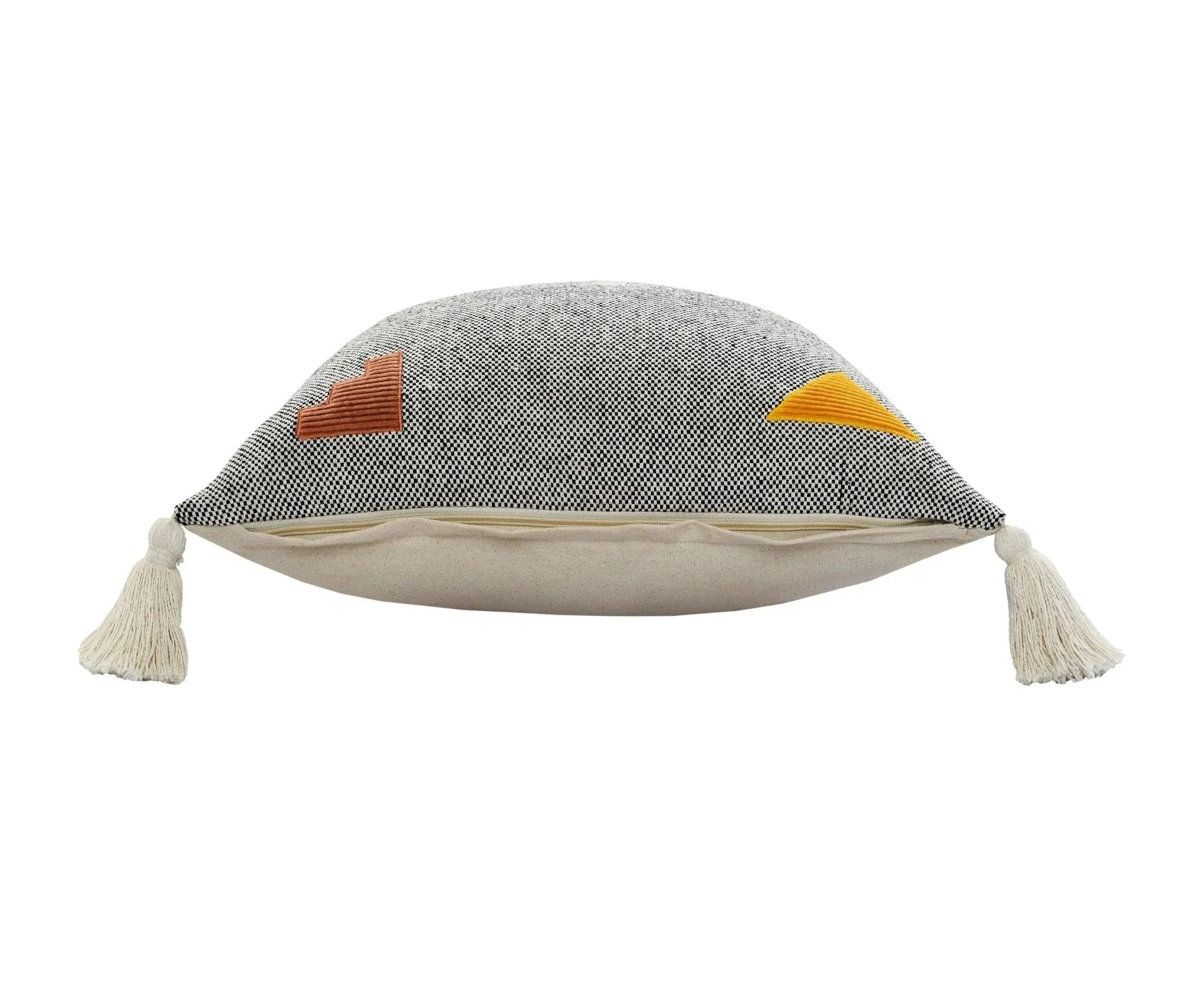 Replenish your soul in nostalgic joy with our Zeal Collection! This collection offers soft, plush textures with playful bohemian vibes. This accent features charming geometric cotton velvet patchwork that frames the center and corners before transitioning to playful tassels. Displaying a coordinating contemporary mix of gray, adobe orange, glowing yellow, and cream, this throw pillow will enhance your home's vibrancy. Place this accent in a bedroom, living space, kid's area, or entryway for eye-catching style and endless compliments. Handcrafted with the customer in mind, there is no compromise of comfort and style with the pillow line we create.